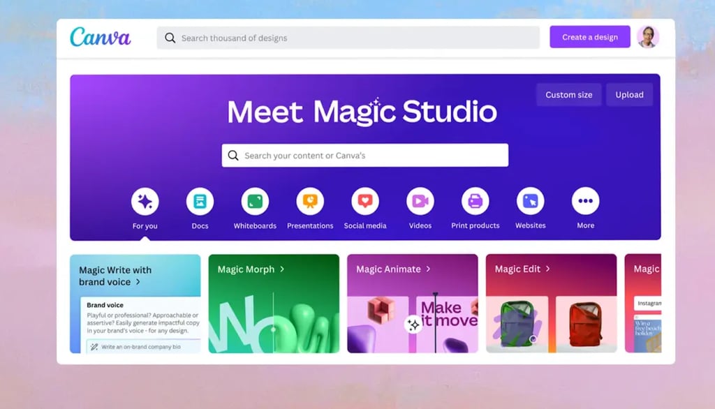 Canva Magic StudioCanva: Ha democratizado el diseño y ahora da un paso más con su versión potenciada por inteligencia artificial. Desde generar imágenes hasta crear presentaciones o diseños en segundos, permite que cualquier persona comunique de forma visual sin necesidad de un diseñador. Perfecto para redes sociales, flyers o páginas web.